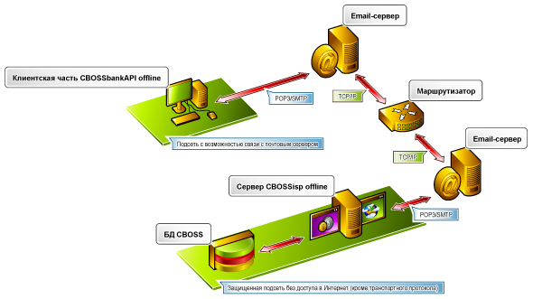 Основное отличие CBOSSbankAPI offline от CBOSSbankAPI online – отсутствие необходимости постоянного подключения точки приема платежей к коммуникационной сети. Клиентская часть системы формирует заявки на регистрацию платежей в CBOSSbcc и периодически отсылает их в автоматическом либо ручном режиме по почтовому протоколу с использованием интернет-канала или кратковременного контролируемого соединения с почтовым сервером.